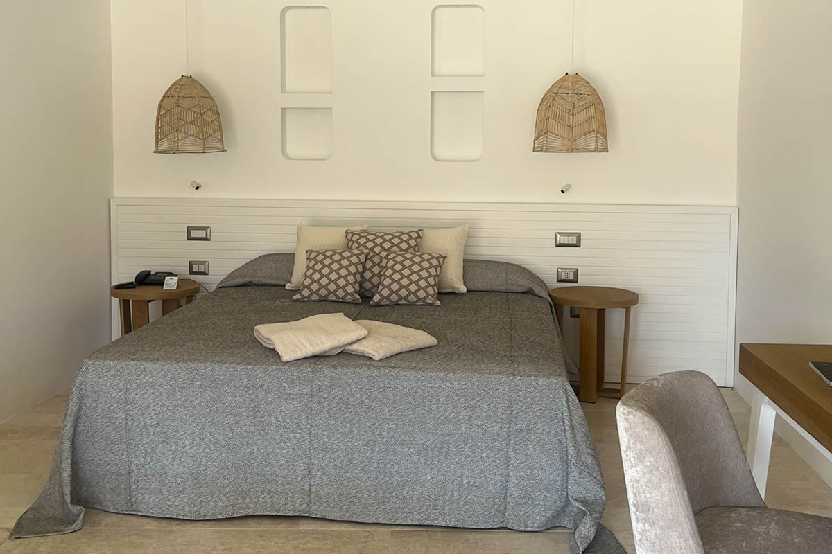 Les chambres Classic, situées dans le bâtiment principal ou dans l’annexe, mesurent entre 21 et 26 m² et sont idéales pour 2 à 3 personnes. Les chambres Deluxe, de 18 à 23 m², offrent un espace moderne et confortable avec une grande douche à l’italienne. La version Deluxe Vue Mer séduit par sa vue magnifique sur la baie et son ambiance encore plus charmante, grâce au style sarde décliné en blanc et bleu.