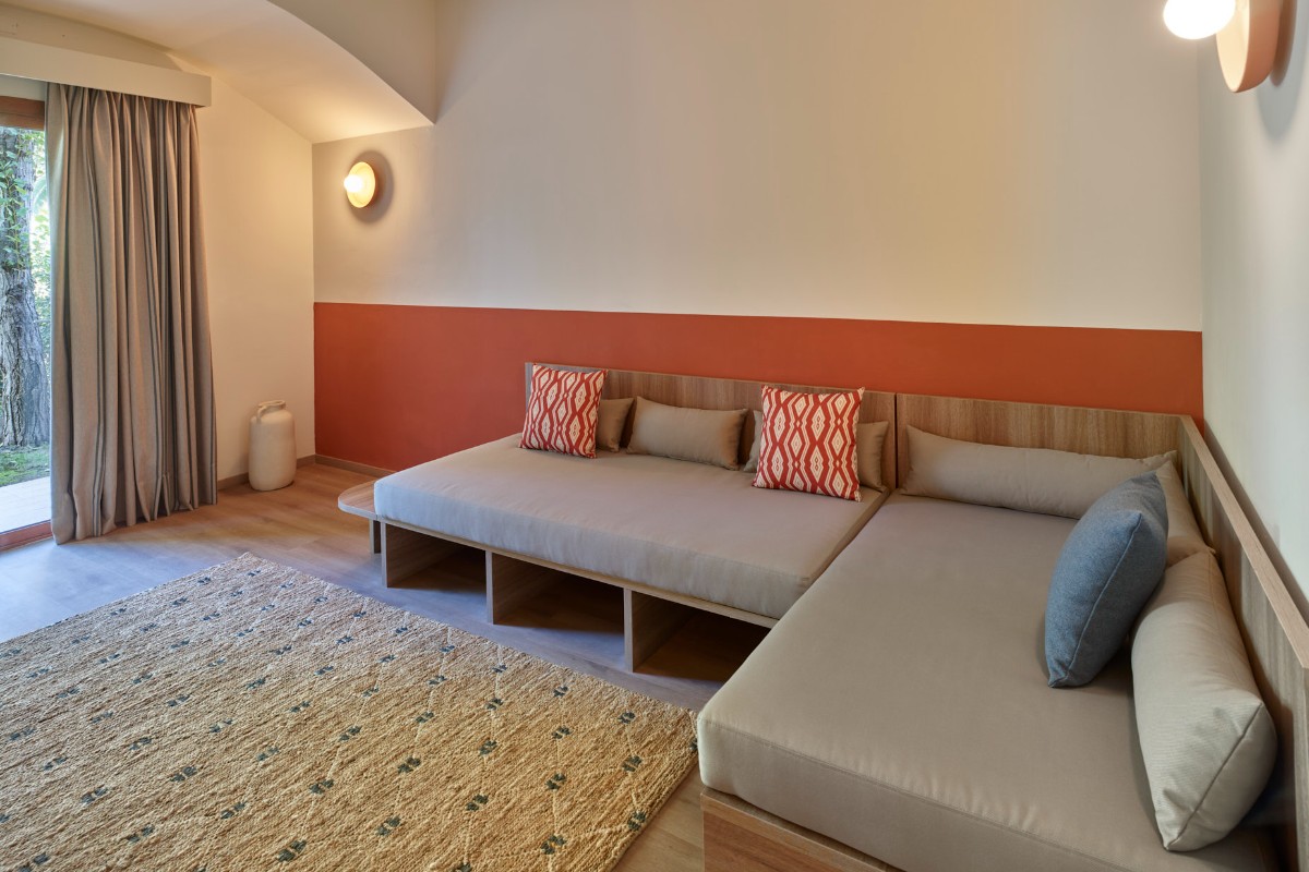 They have two rooms: sleeping area with double bed and living area with double sofa bed or double chaise-longue. They also have a kettle with tea and herbal teas, espresso machine, open mini bar (water, 2 soft drinks and beer), TV with Sky, one beach towel per person (from 3 years old) with daily change. Also available are the Garden Suite with garden and the Balcony Suite on the first floor with terrace. Suite guests have their own restaurant, the New Gusto.